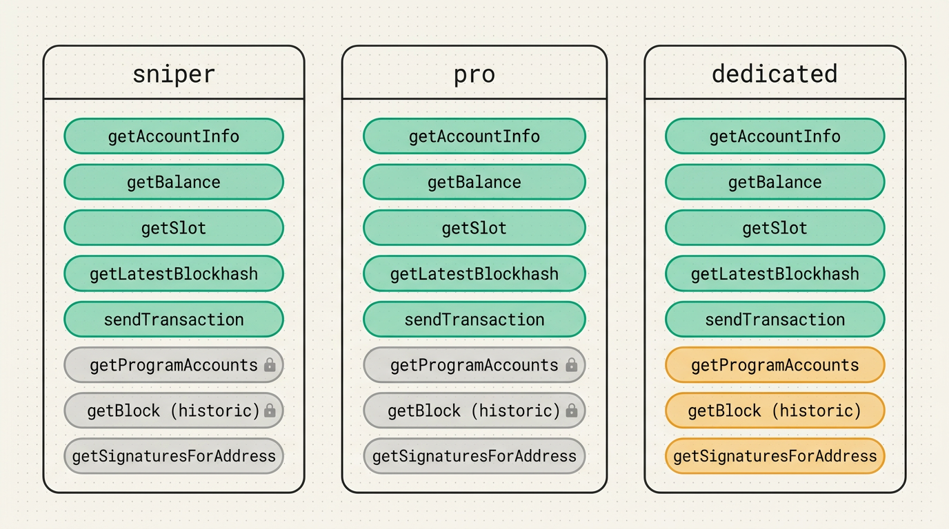 This covers every method a typical Solana trading bot, copy trader, or sniper needs. If your workload stays inside this list, you never have to think about the gating.
